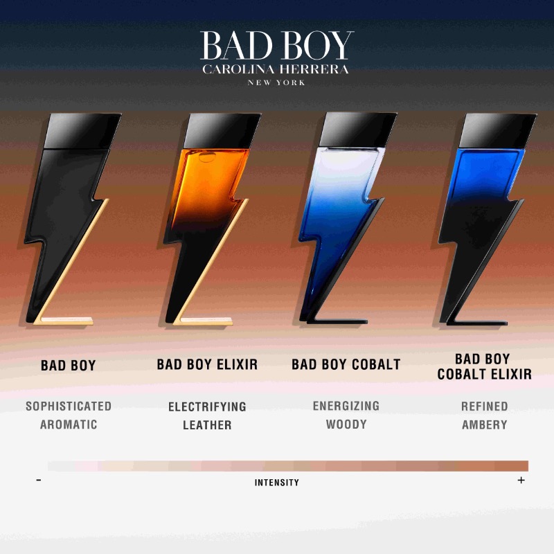 The iconic Bad Boy lightning bolt is elevated with a luxurious brown bottle, reflecting the refined leather note that defines this powerful elixir.